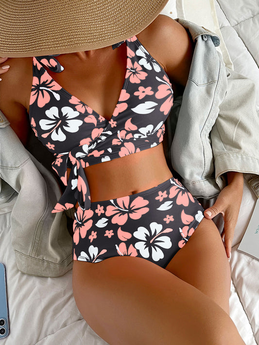 Lace Up Printed High Waisted Bikini Split Swimsuit For Women